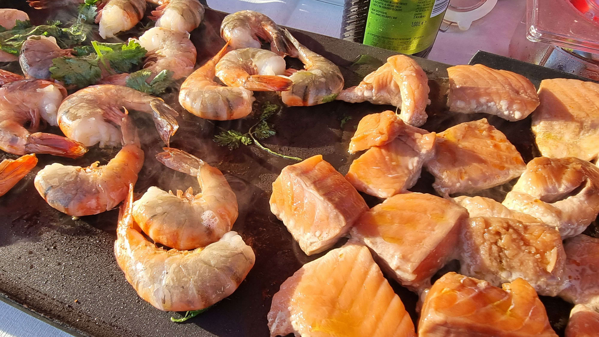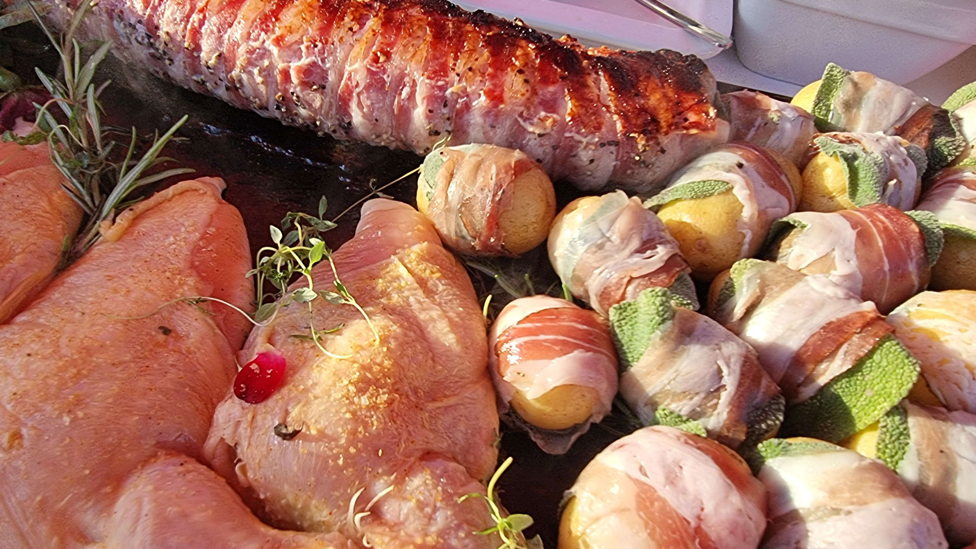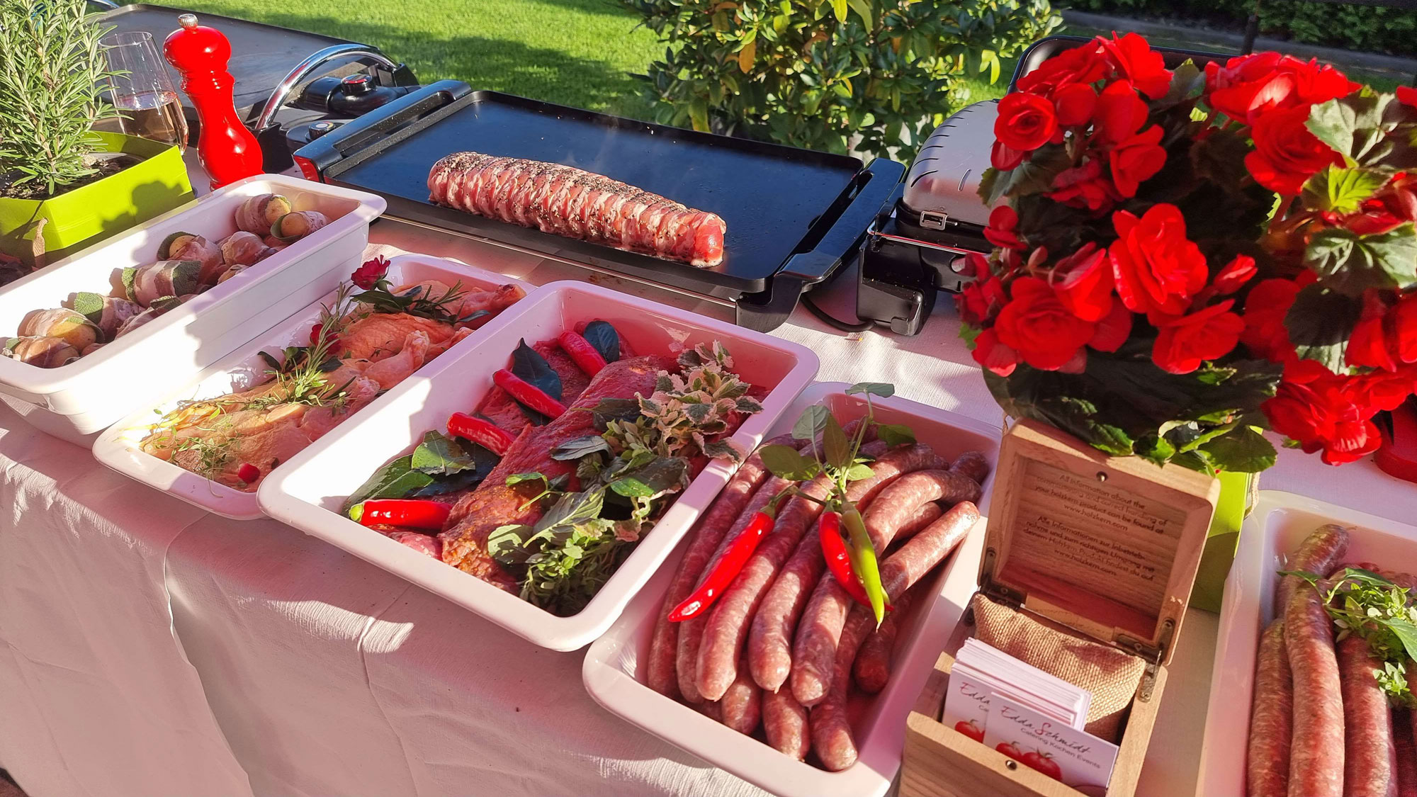 Die Kalkulation erfolgt bewusst nachhaltig: 300 g Fleisch, 300 g Salate und Beilagen sowie 100 g Dessert – ausreichend für ein zufriedenstellendes und ausgewogenes Menü, ohne unnötige Lebensmittelverschwendung. Sollten besonders viele Gäste mit hohem Fleischkonsum erwartet werden, passen wir die Mengen individuell an. Für die Zubereitung benötigen wir vor Ort mehrere getrennte Stromkreise, da wir mit leistungsstarken Elektrogrills arbeiten, die gleichbleibend hohe Qualität gewährleisten.